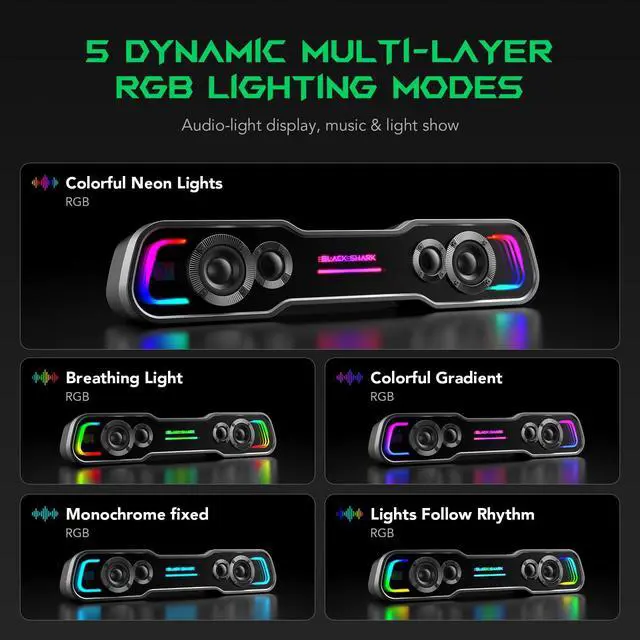 5 Dynamic Multi-Layer RGB Lighting ModesThe monitor speakers features five dynamic multi-Layer RGB lighting modes: Colorful Neon Lights, Breathing Light, Colorful Gradient, Monochrome fixed, Lights Follow Rhythm. Vibrant lighting creates an immersive ambiance for your gaming, movie, and music moments, delivering a captivating visual experience. Customize the effects to suit your personal preference - simply press the lighting button to switch between modes.