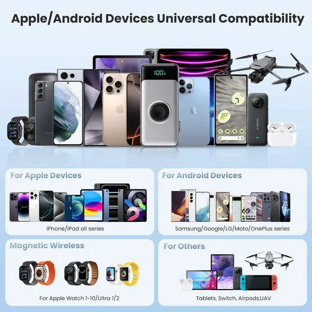 | Special features | All-in-One Charging Solution, 5-in-1 Massive 40800mAh Capacity, Retractable Cables Built-In, Magnetic Apple Watch Charger, 5 Outputs 2Inputs Charge 5 Devices Simultaneously, 25W PD/QC4.0 3X Fast Charging, Smart LCD Display, SMART SAFETY PROTECTION,TRAVEL-READY DESIGN, Universal Compatibility |