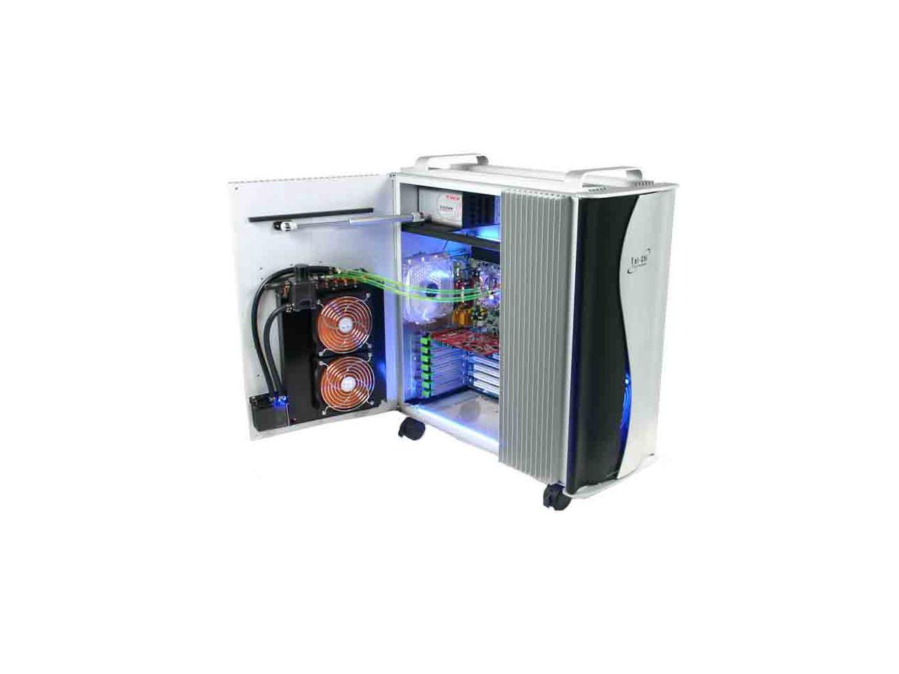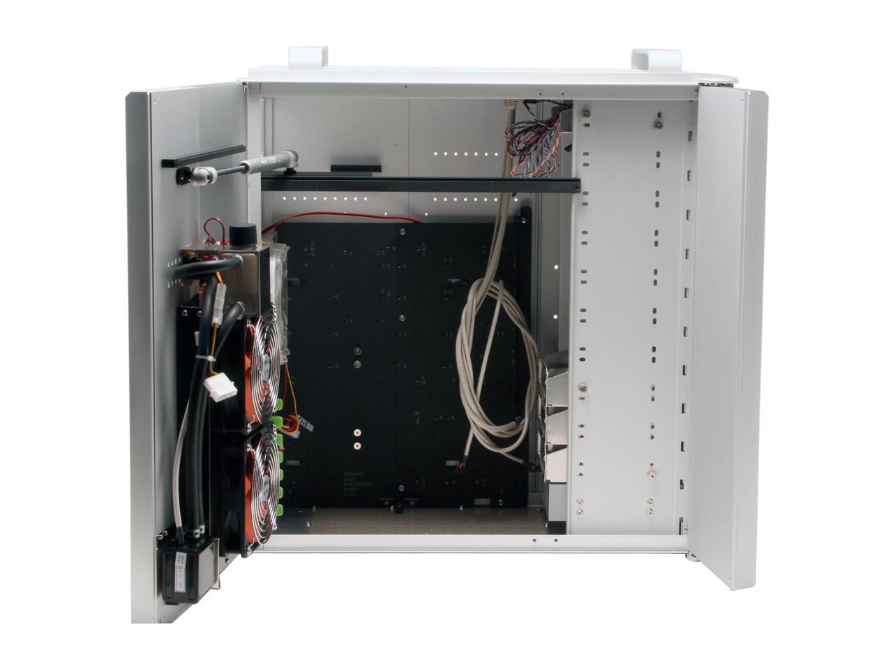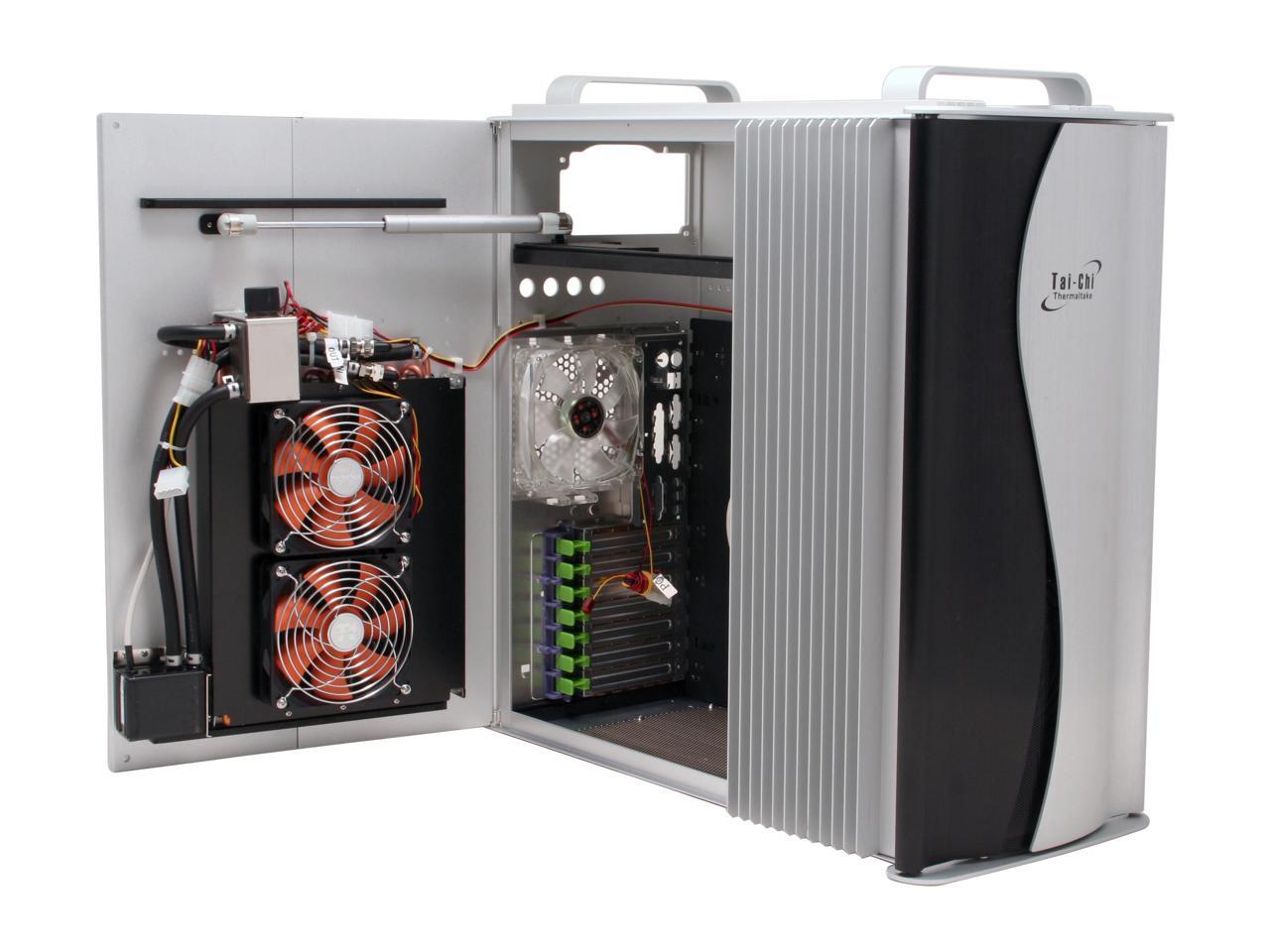 | Features | All aluminum extrusion built chassis Compact and stylish chassis Better choice for upgrading liquid cooling system Hydraulic side panel opening Tool-free installation Optimize internal space and airflow Relocate-able front control panel (Power, Reset switch, HDD & PWR LED) Removable aluminum motherboard tray Easy Lifting Handles Liquid Cooling system: 4 in 1 universal water block: All copper base with blue LED, and universal clips Cooling system: Dual 1300rpm 12 cm fan with performance radiator 12V liquid pump: Powerful DC 12V liquid pump (84 L /Hour) Liquid Tank: Easy to refill the coolant Water tubes: Transparent green water pipes |
