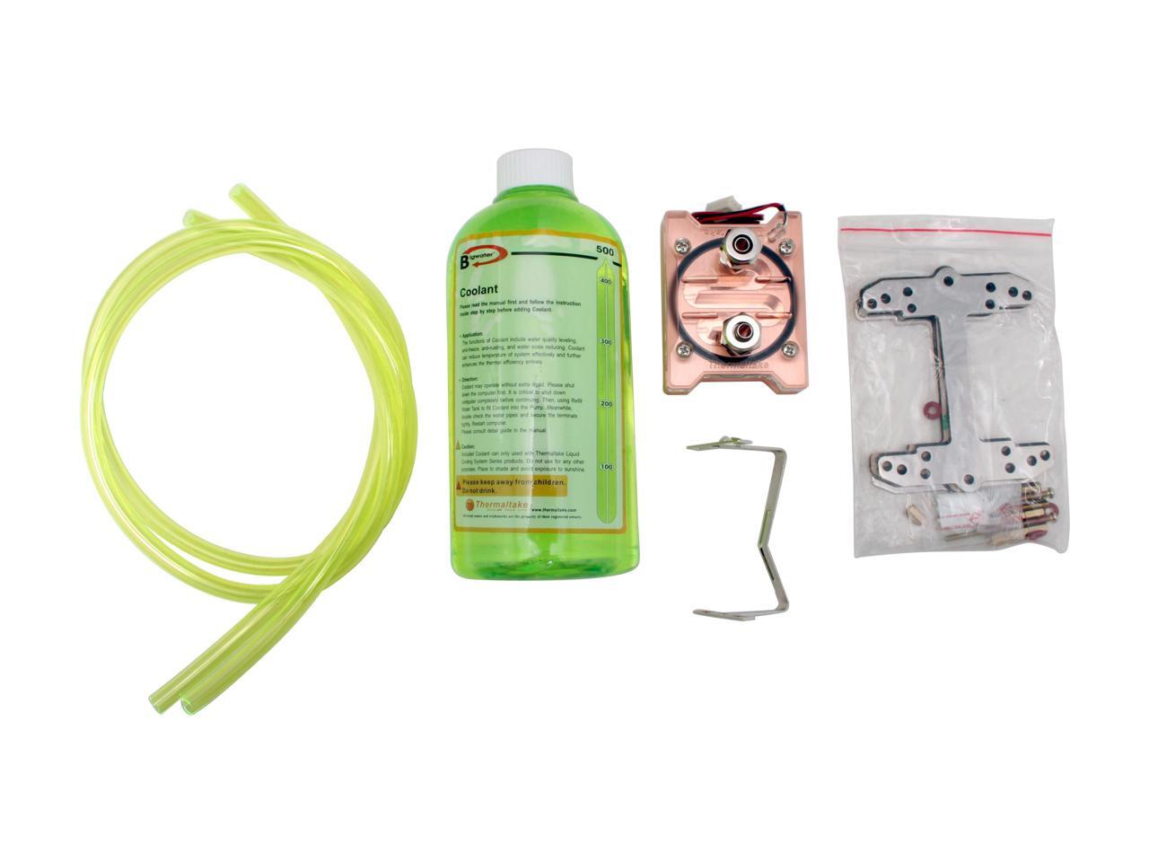 Cons: I had mine for a few months before the pump spring a leak and stopped working. The rubber hoses are clamps and GLUED to the plastic barbs on the pump, the resovoir, and the metal on the radiator. The RMA pump that Thermaltake sent me had compression fittings that didn't work with the rubber hoses. Then just yesterday the CPU block sprung a leak. Somehow, the plastic top cracked and started leaking coolant. The radiator and fan placement on the door makes it impossible to use a full coverage GPU water block with the system. My 7900 GTX barely fits without modifications. I'm done with Thermaltake water cooling. I'm ripping everything out of that case and replacing everything with quality parts. I'd throw the whole thing out, but I spent too much money on it.