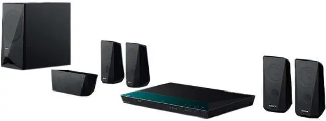 1000W 15 5.1channel 3D Blu-ray Disc Home Theater System Built-in Wi-Fi: Stream Netflix, HuluPlus, Pandora & more 1 Full HD 1080p: Upscale standard DVDs to near HD quality Wirelessly stream music from Bluetooth devices w/just one-touch 11 Full range bass reflex speaker system & 7.1 sub-woofer Experience HD sound with Dolby TrueHD and dts-HD Life-like stadium sound with Football sound mode Wirelessly access music, photos, etc. on your home network 5 Restore lost audio fidelity with Digital Music Enhancer Access and playback content from USB devices HDMI 1.4 (w/ARC): Digital Optical & Analog Audio Inputs FM Radio with 20-station Presets: Remote Control Broadband speed of at least 2.5 Mbps recommended (10 Mbps for HD). Content subject to change and may require fees. Wireless connectivity requires an 802.11 home network. Requires 3D content, 1080p 3D HDTV, 3D glasses, 3D emitter, and HDMI cable (at least 10.2 Gbps). Applications must be downloaded from the iTunes or Android application store. Check Android market from your device for compatibility. Requires devices connected to the same wireless home network. Requires Sony HomeShare compatible products and a home network. Requires a home network with content stored on a DLNA compliant PC or server, and HomeShare network speaker, dock, or Blu-ray Disc player or home theater system. See dlna.org for compatibility. Simulated 3D image will vary based on source content. Not all USB devices are supported. Please check Owners Manual for compatibility. Requires compatible HDTV and HDMI cable sold separately. Requires HDTV with equivalent display and HDMI cable sold separately. Requires devices connected to the same wireless home network. Requires NFC-enabled device and downloadable NFC app. Check devices user manual for compatibility. TV SideView Application must be downloaded from the iTunes or Google Play application store. Check Android market from your device for compatibility. Requires devices connected to the same wireless home network. Socialize requires user to have Twitter or Facebook account setup on player and internet connectivity. Gracenote requires internet connection. Measured at 3 Ohms, 80Hz 1 kHz with a THD of 1%
