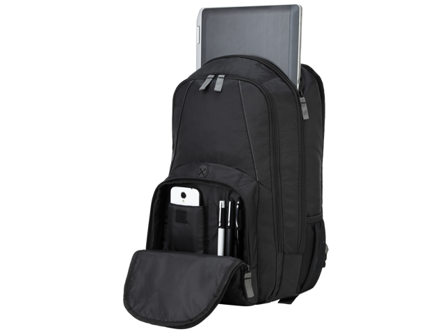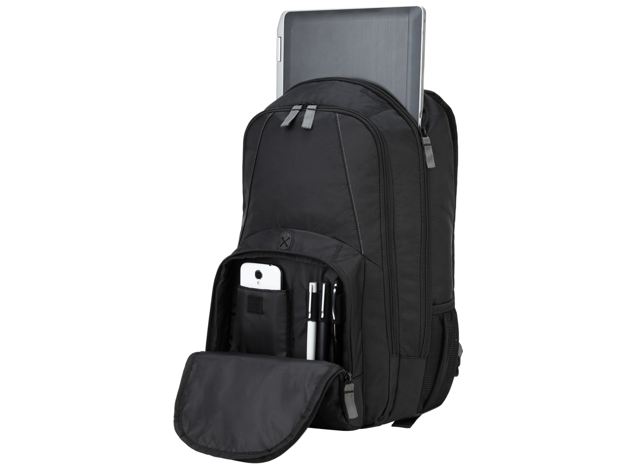 - Front storage section includes a media compartment with lineout headphone port, cell phone pocket, pen loops and a key clip. Extra pocket for files or accessories; side pocket for extra storage and water bottle transport