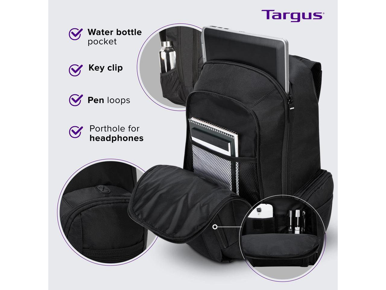 - Easily accessible water bottle holder placed safely away from sensitive electronics and important files.