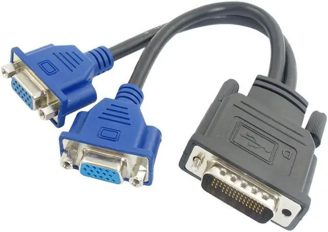Connector: 1 x DMS-59 (male), 2 x 15 pin VGA (female) Split the video signal from your DMS-59 video output to two separate monitors Connect your computer to two monitors through one video card Foil shielded to prevent EMI/RFI Interference Compatible with DELL, SONY, COMPAQ, HP, Gateway, and other manufacturers Description DMS-59 is a 59-pin electrical connector generally used for computer video cards. It provides two DVI or VGA outputs on a single connector. An adapter cable is needed for conversion from DMS-59 (digital) to DVI (digital) or VGA (analog), and different types of adapter cables exist. The connector is four pins high and 15 pins wide, with a single pin missing from the bottom row, in a D-shaped shell, with thumbscrews. The application for DMS-59 is to support a higher density of video displays, in a similar amount of connector space to a DVI connector. DMS-59 supports two DVI Single Link digital channels or two VGA analog channels from a single connector. The compact size lets a half-height card support two high resolution displays, and a full-height card (with two DMS-59 connectors) up to four high resolution displays.