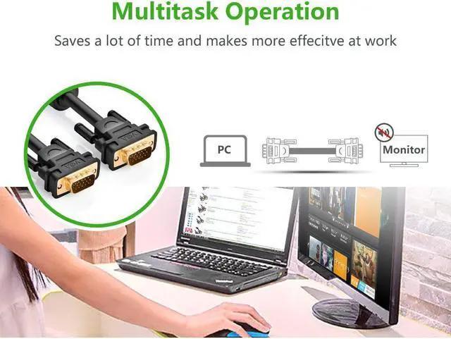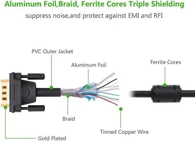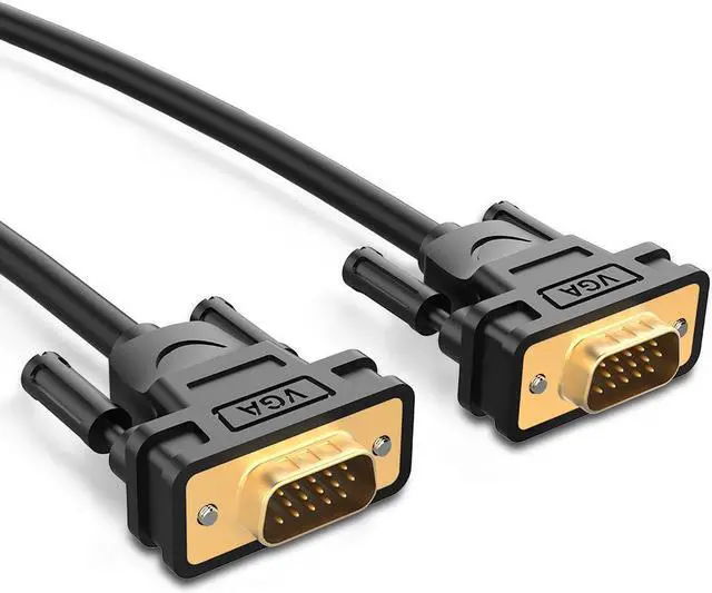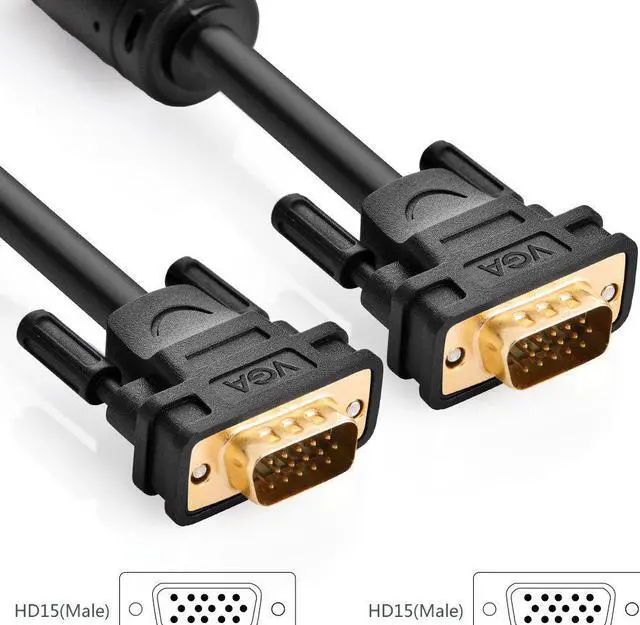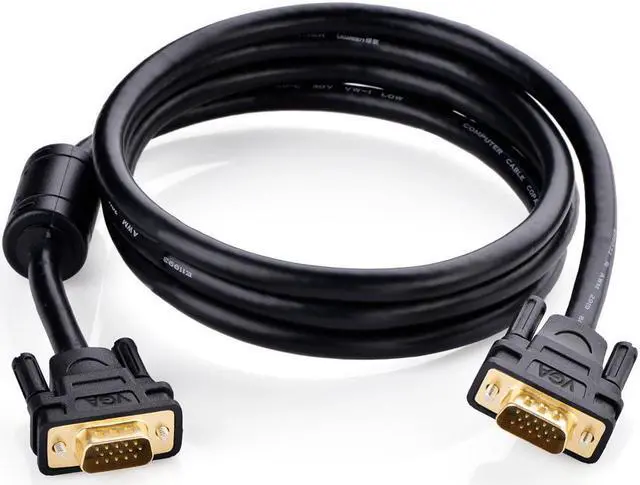 Foil & braid shielding and integrated dual ferrite cores on the VGA wire minimize crosstalk, suppress noise, and protect against electromagnetic interference (EMI) and radio frequency interference (RFI) Supports resolutions at 800x600 (SVGA), 1024x768 (XGA), 1600x1200 (UXGA), 1080p (Full HD), 1920x1200 (WUXGA), and up for high resolution LCD and LED monitors Connects PC or laptop to the projector, LCD monitor, and other video display system through VGA connections. Gold-plated connectors and 28AWG pure OFC copper conductors provides this monitor cable with superior cable performance. High performance VGA cable connects a VGA (Video Graphic Array) equipped computer to a monitor or projector with 15-pin VGA port (also known as RGB, DB-15, DE-15, HD-15, HDB-15 or D-sub 15) for video editing, gaming, or video projection.