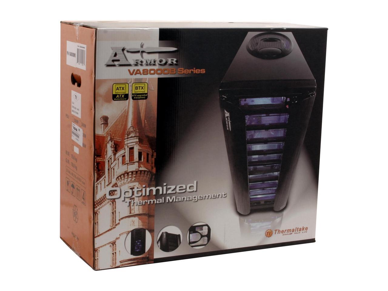 Optional BTX Upgrade KitThe Thermaltake Armor VA8000BWS provides an optional BTX upgrade kit including a BTX rear plate and BTX SRM for users expecting to build a system with a BTX motherboard.