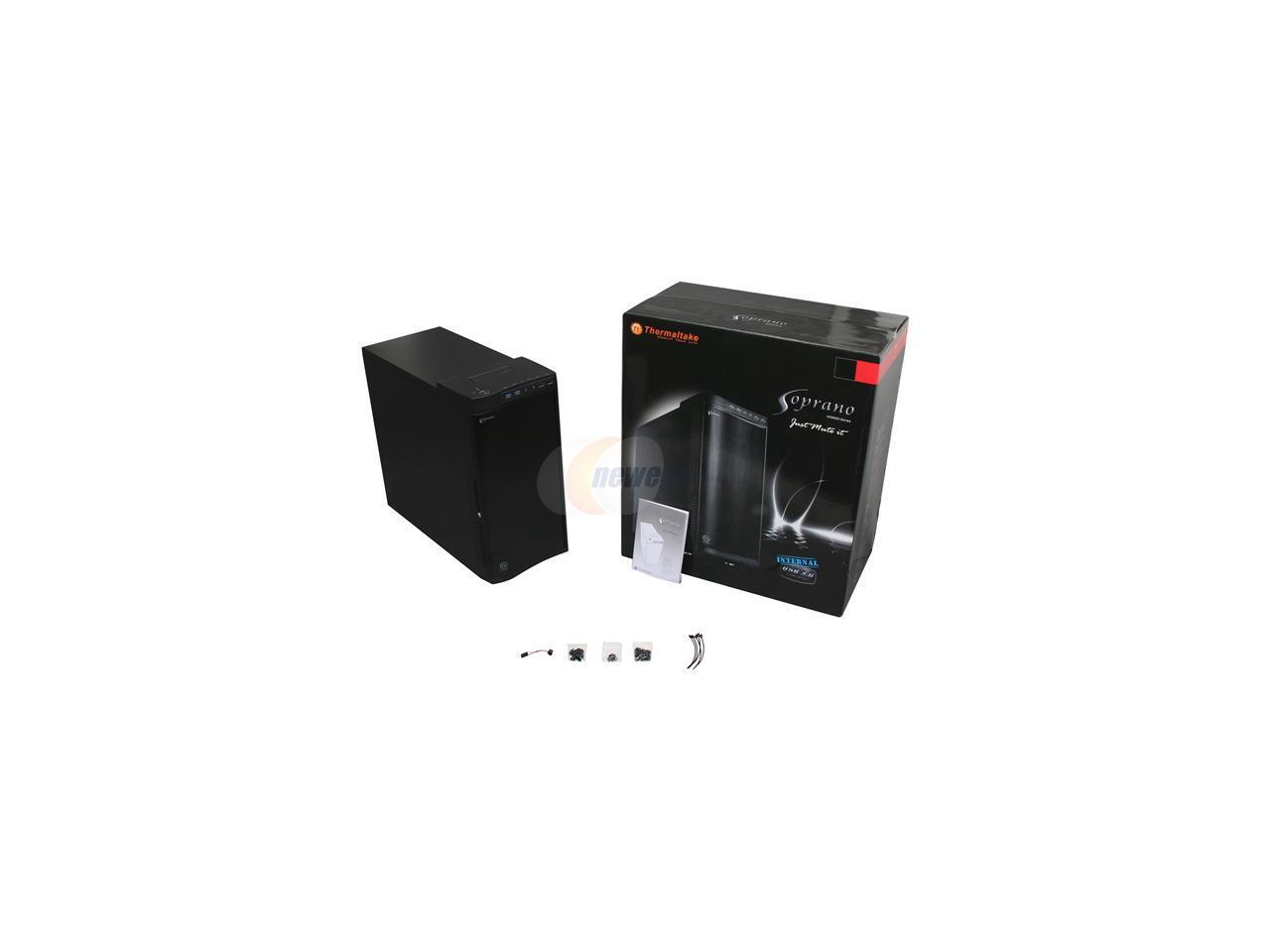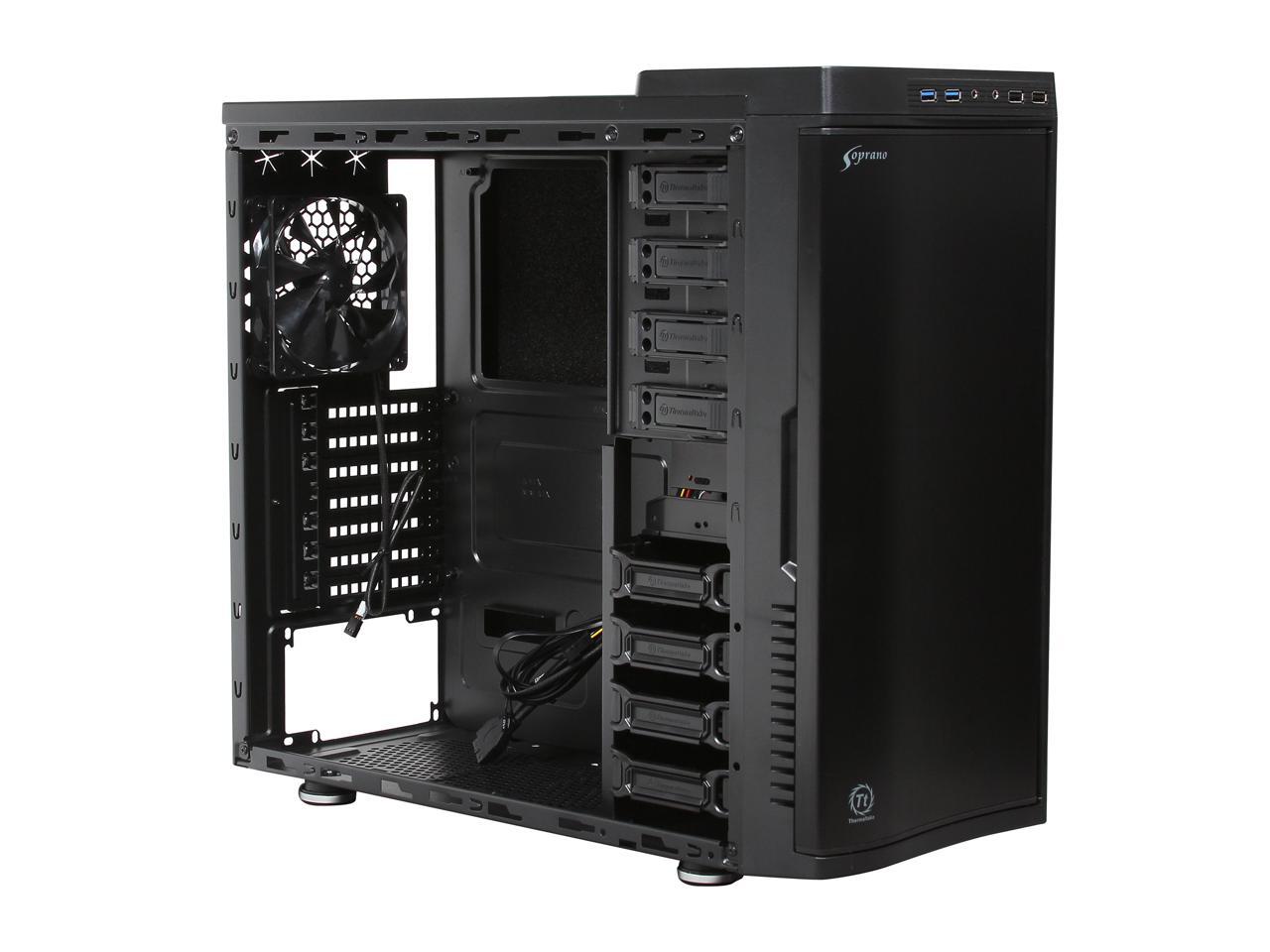 The Thermaltake SOPRANO is a premium Mid Tower case that perfectly blends performance, function and design to honor your dream system. All black coating with beautifully curved aluminum front panel emanates high grade feel and monolithic aesthetics demanded by discriminating users. Hardcore gamers would be delighted by up to 31cm long graphics card support, tool-free ODD & HDD installation, cable management and bottom placed PSU design. Enjoy extreme peace of mind with sound-dampening foams. Complete with top mounted HDD docking station and USB 3.0 connectivity, the Thermaltake SOPRANO offers a second to none choice for your next PC build or relocation of existing system.