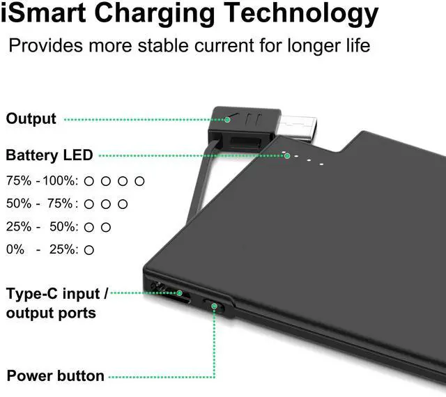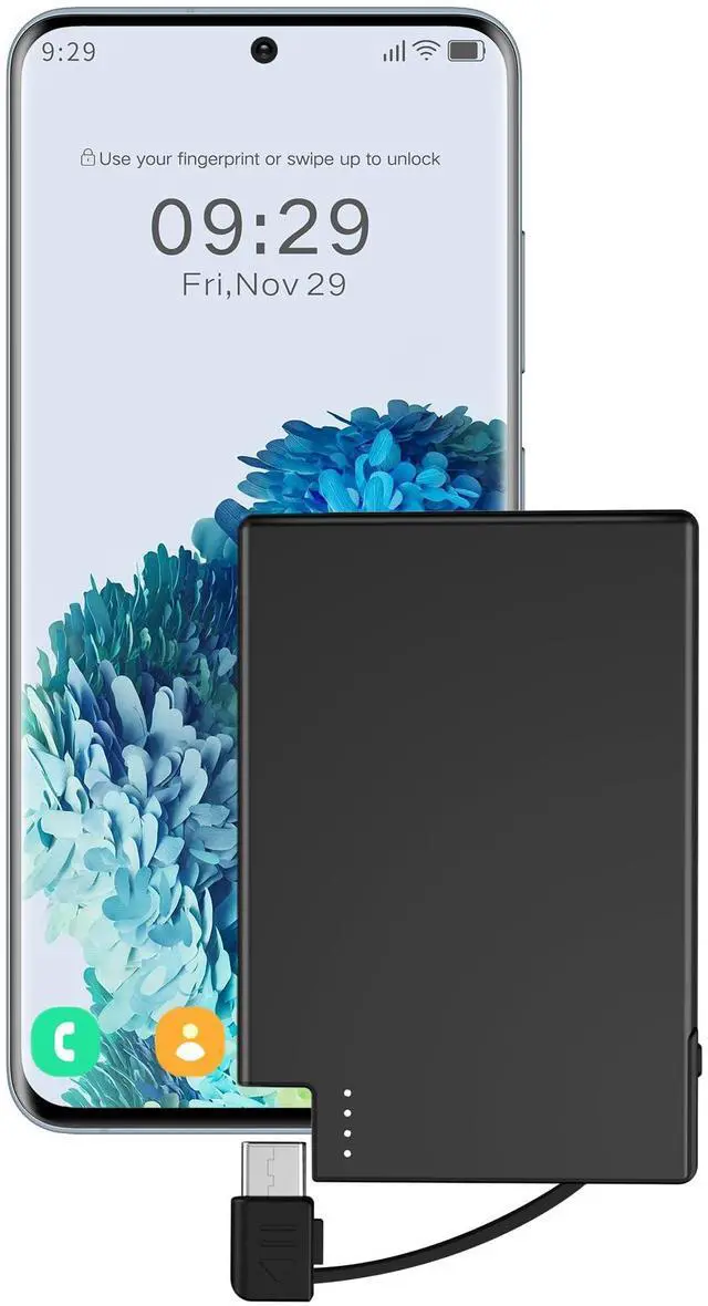 Thin USB-C Portable Charger with Built in Cable, Slim Power Bank Credit Card Size Battery Pack Charger Portable for Wallet Compatible with iPhone 15 16 17 Series, Samsung and Android Phones