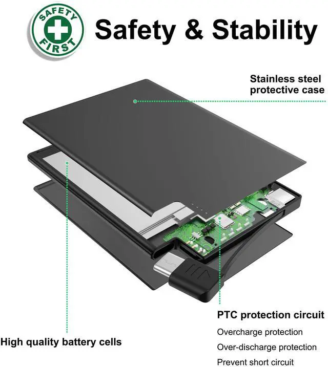 [Thinnest Portable Charger Ever] - Credit Card Size power bank for iphone only 3.54*2.52*0.16 inch (about half of iPhone 15 size), weighing only 2.58oz. Thecharge card phone charger easily fit into your pocket, pouch and wallet.
