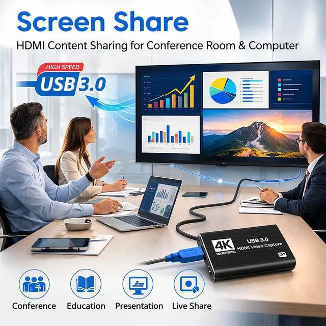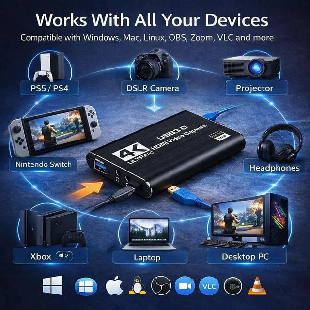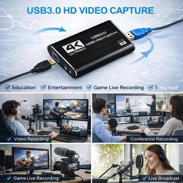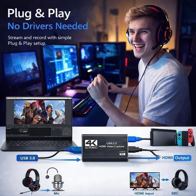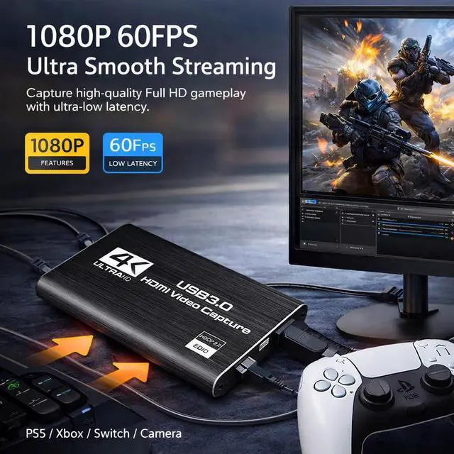 Enhance your streaming and recording setup with this HDMI capture card designed for smooth and reliable video capture. Supporting Full HD 1080P resolution at 60FPS, this capture device allows you to record and stream high-quality gameplay, live video, or presentations with clear visuals and minimal delay. The USB 3.0 interface ensures fast and stable data transfer, delivering low-latency performance ideal for live streaming, content creation, online teaching, and video conferencing. With the built-in HDMI loop-out port, you can enjoy real-time gameplay on your monitor while simultaneously capturing the video for streaming or recording. This capture card also features a 3.5mm microphone input, allowing you to add live commentary or voice chat while streaming or recording gameplay. Its a great tool for streamers, gamers, and content creators who want to deliver more engaging broadcasts. Designed with plug-and-play functionality, the device requires no additional drivers or external power. Simply connect the capture card to your computer using the included cable and start recording or streaming instantly with popular software such as OBS Studio, Streamlabs, VLC, and other video capture applications. The capture card offers wide compatibility with multiple devices and platforms, including PS5, PS4, Xbox, Nintendo Switch, DSLR cameras, PCs, and laptops. It works seamlessly with Windows, macOS, and Linux, making it a versatile and convenient solution for gaming, streaming, and professional video capture. Compact, lightweight, and easy to use, this HDMI video capture card is an excellent choice for anyone looking to improve their streaming quality or capture high-definition video from their favorite devices.