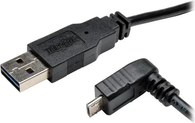 Tripp Lite UR050-006-DNB, 6-ft. USB 2.0 A to Down-Angle Micro-B cable, features a Universal / Reversible "A" connector, which takes the guesswork out of which way to position the "A" connector for plugging. Furthermore, the Down-Angle Micro B connector is ideal for situations where space is at a premium, and reduces stress / excessive bending on the cable. Micro-USB is the next generation of USB connector that will be found on Cell Phones, PDA's, USB On-the-Go ( OTG ) devices, Digital Cameras, and more. Smaller and more durable ( 10,000 insertion cycles ) than the existing mini-B connectors, the Micro-USB will also handle Power transfers, as well as Data. The USB Implementers Forum ( USB-IF ) has designed the Micro-USB to eliminate many of the proprietary Mini connectors found on different manufacturers digital devices, and it will be the standard USB connection on phones from the major cell phone manufacturers. USB 2.0 rated cable handles 480Mbps data transfer rates.