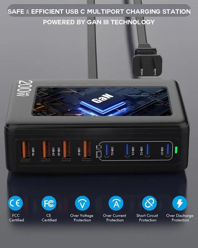 1.The 8-port USB C charging station adopts 200W GaN III chip technology.