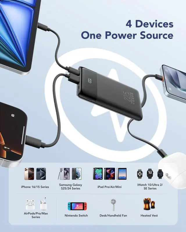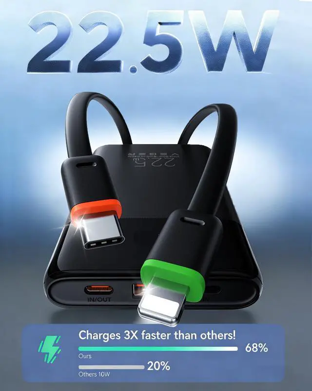 Our portable charger with built-in cables is an upgraded design. We removed outdated ports to make it more compact and lightweight, focusing on the cables modern devices actually need. It’s the smarter portable phone charger for daily carry.