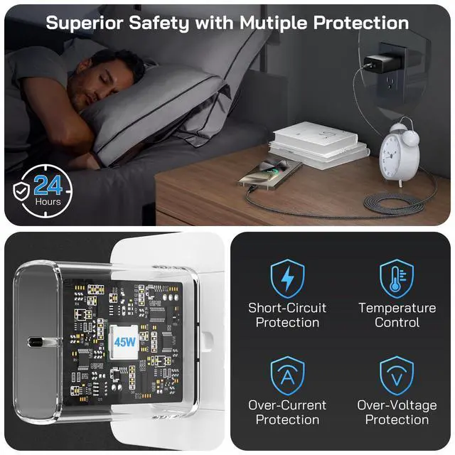 Built-in Multi-Protect system, this Samsung Galaxy S24/S23/S22 Ultra Charger protects your phones/tablets/laptops against over-load voltage/current, short-circuit and over-temperature, keep you and your devices safe all the time.