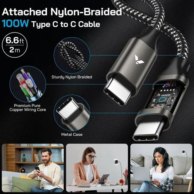- Attached 100W USB C to USB C nylon-braided cable, charges at 5A super speed, 6.6ft extra length offers max flexibility.