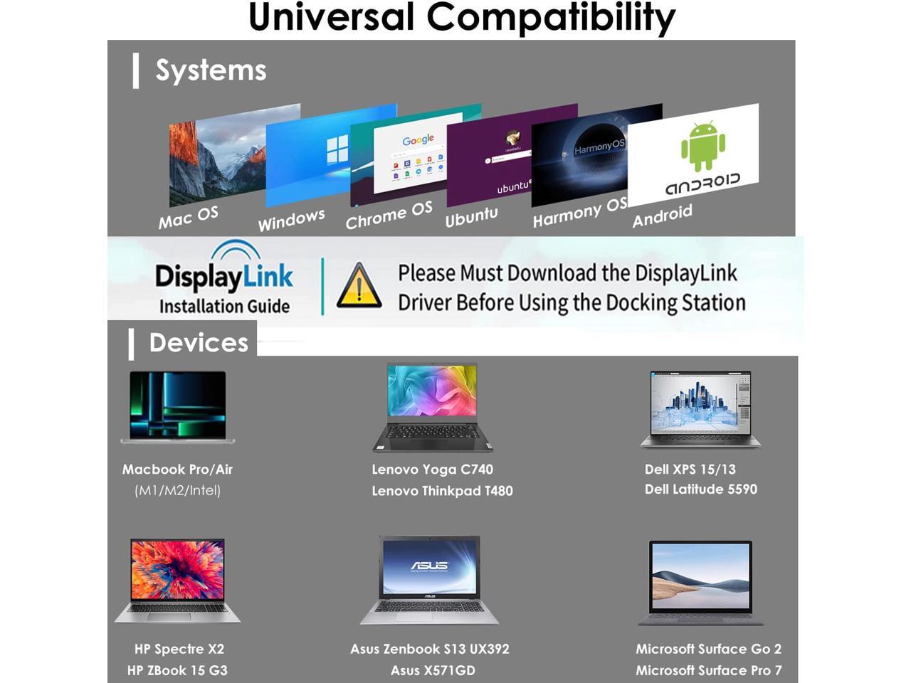 - Compatibility with Apple M1/M2 and Intel Macs (with macOS 10.14 or later) .Support Windows 11, 10, 8.x, and 7 with driver installation.Surface RT, Linux/Unix are not supported. (see Display Link website for more details)