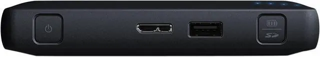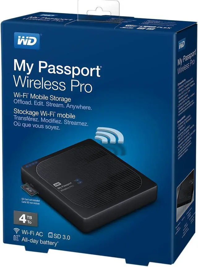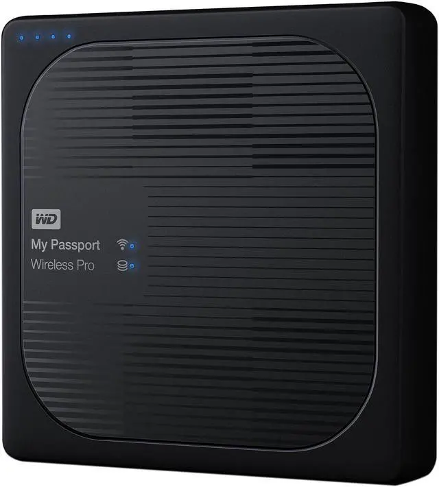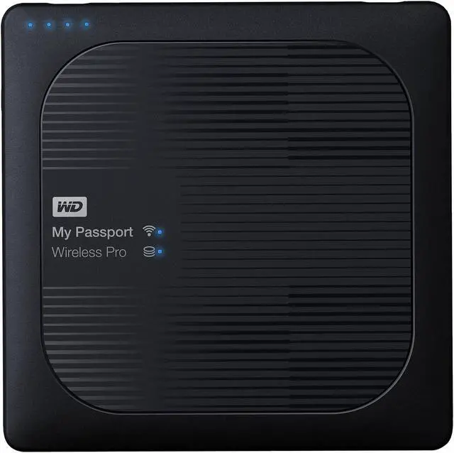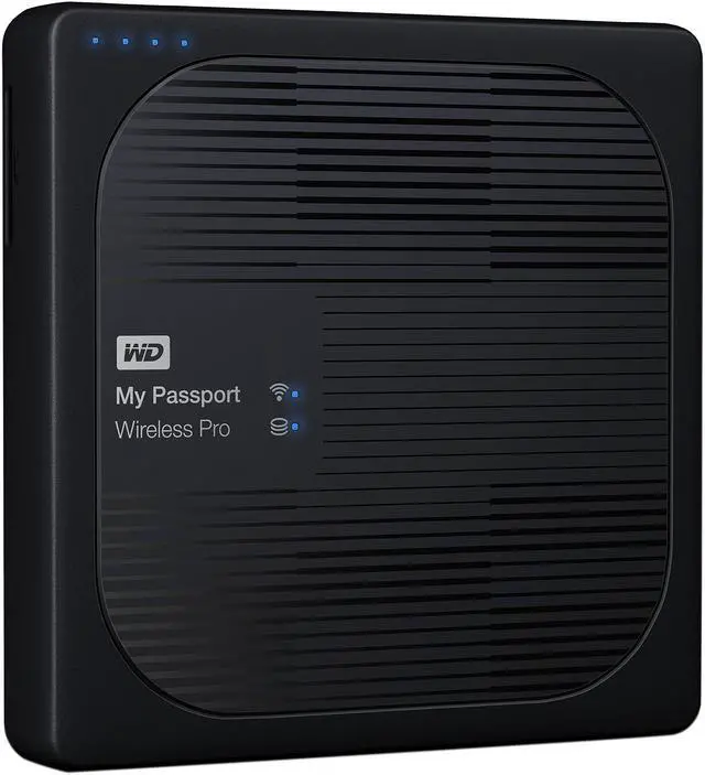 | Features | Wireless storage wherever you go Built with wireless 802.11 ac technology, you can quickly transfer images and videos wirelessly from a compatible camera. Once on the drive, you can back up, view or edit your shots with a connected tablet or laptop. Save time with SD 3.0 Equipped with an SD 3.0 card reader, you can quickly back up photos and videos on the fly. Offload your camera's entire SD card in one move and keep your workflow running smooth. All-day battery life Up to 10 hours of continuous use.* Bring it on an all-day photo shoot and stay out in the field longer. Take it on a long trip and continuously stream videos on the road or in flight.* * Based on streaming HD 720p, 3 Mbps video to one device over Wi-Fi 2.4 GHz single band only. Actual battery life depends on file size, type, format, bitrate, devices connected, Wi-Fi connectivity, settings and other factors. Built-in power bank Charge your smartphone or other USB devices on the go with the integrated 6,400 mAh power bank. Super-fast USB 3.0 transfer speeds Save time when moving or backing up. RAW images or HD videos with the transfer speeds of USB 3.0. Import media from external USB devices Use the convenient USB 2.0 port to easily transfer media from an external USB storage device, like a compatible DSLR or CF card reader. Beautifully organize and stream with Plex Plex organizes your entire media collection with one simple interface and visually enhances it by adding descriptions, plot summaries, posters and album covers. Wirelessly stream media stored on your My Passport Wireless Pro to all your devices, including your PC and Mac computers, smartphones, tablets, Smart TV and more. Access files wirelessly Wirelessly connect My Passport Wireless Pro to your mobile devices using the My Cloud mobile app so you can view, organize, edit and share your media files from anywhere with your tablet and smartphone. |