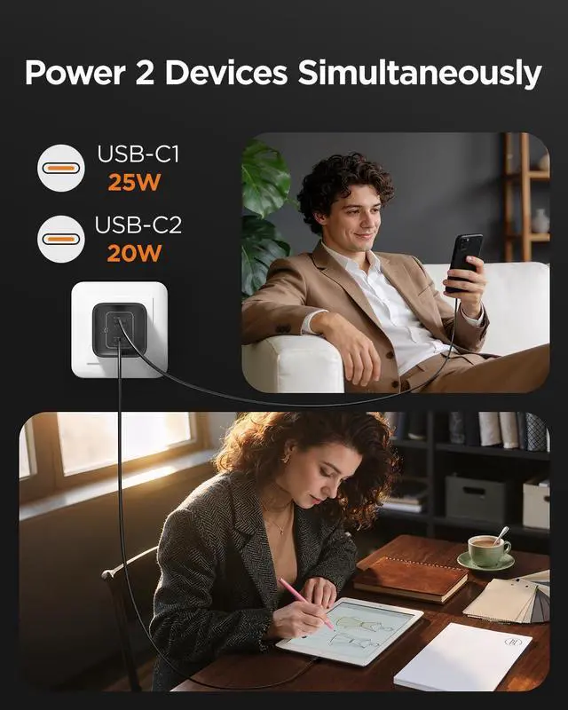 • Charge 2 Devices Simultaneously: With 25W from one USB-C port and 20W from the other, you can fast charge your iPhone and iPad at the same time, ensuring efficient power distribution for multiple devices.