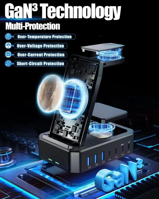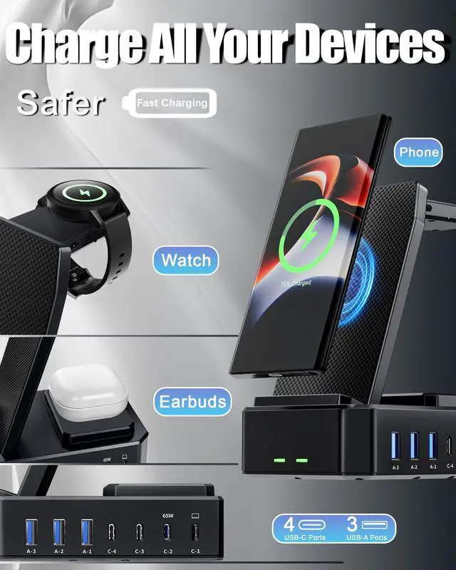 300W Charging Station for Multiple Devices: Charges up to 10 devices simultaneously.This desktop phone charging station is the perfect solution for charging multiple devices! Our charger station features 2 powerful 65W USB-C ports designed specifically for charging laptops, 2 efficient 30W USB-C ports and 3 versatile 30W USB-A ports . Samsung wireless charging station total output can be up to 300W. You can conveniently fast charge your samsung devices and other devices at the same time.