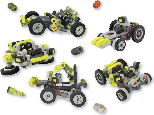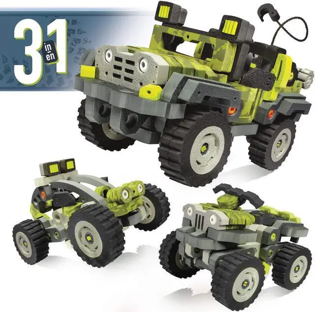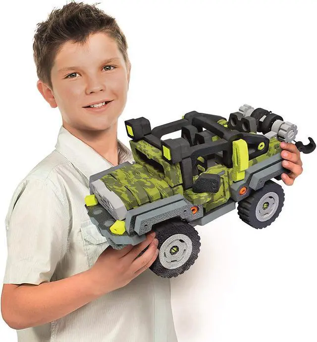 This impressive supersize 3-in-1 off-roading warrior packs a Wild Wheeler, a Dune Buggy, and an ATV, that you can choose to build based on the type of adventure you want. It also frees you to really steer off the beaten path and explore countless other build-your-own combinations. Go ahead and ride hard plough it into the wall or plunge it down the stairs. Your vehicle is made of tough, unbreakable foam that in addition to being really cool to play with, will bounce right off any surface it collides with, without damaging it.