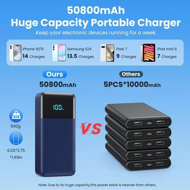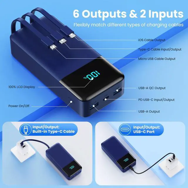 Powerful 50800mAh Portable Battery + 3 Built-in Cables + 6 Outputs and 2 Inputs + Dual 25W PD Fast and High-efficient Charging + 100% LCD Display + Widely Compatibility + Safe and Reliable Battery Pack