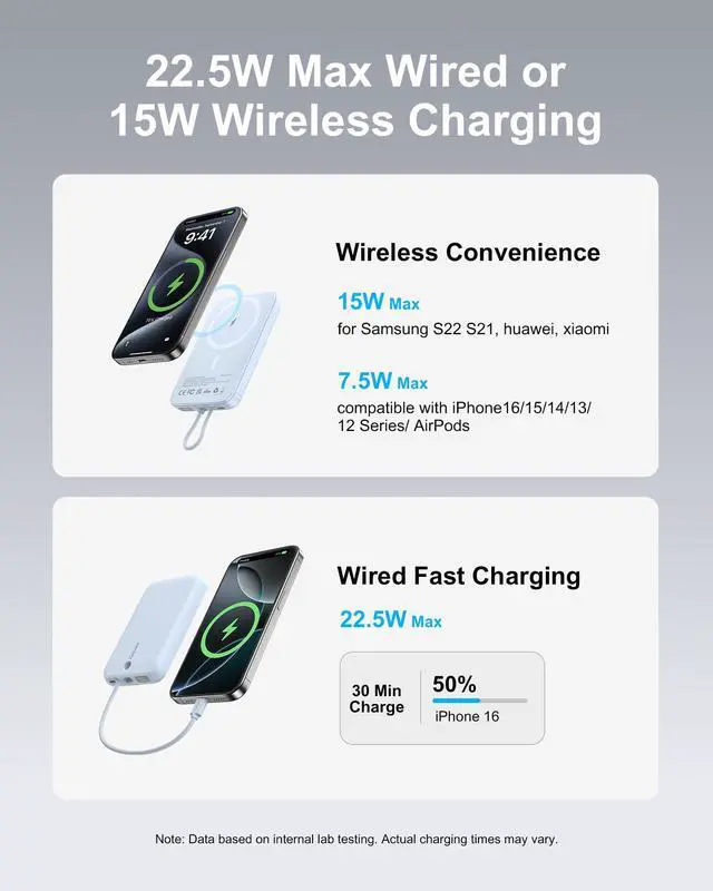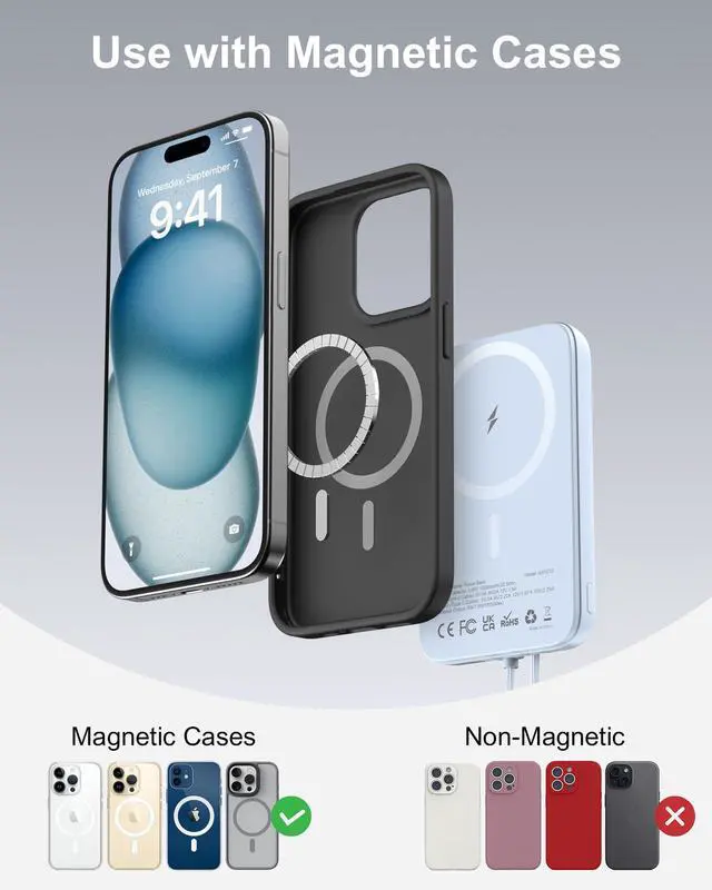 - Pocket-Sized Power & Easy to carry: Compact design to snap to your phone and slip into your pack, purse, or pocket. The portable charger iphone weighing only 0.4 lb, its compact size of 4.33*2.72*0.63 inches, it will not block the camera.(Note: We recommend charging with Magnetic phone case or without cases to get enough suction for better grip)