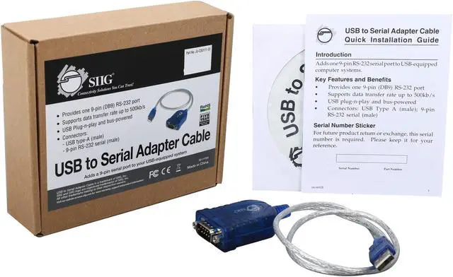 The USB to Serial Adapter Cable is compliant with USB specification, revision 1.1, is FCC and CE approved, and RoHS-compliant. Additionally, it is compatible with a wide variety of Windows operating systems and is backed by SIIG's limited five year warranty.