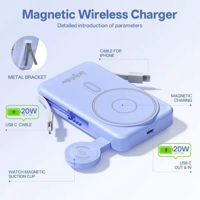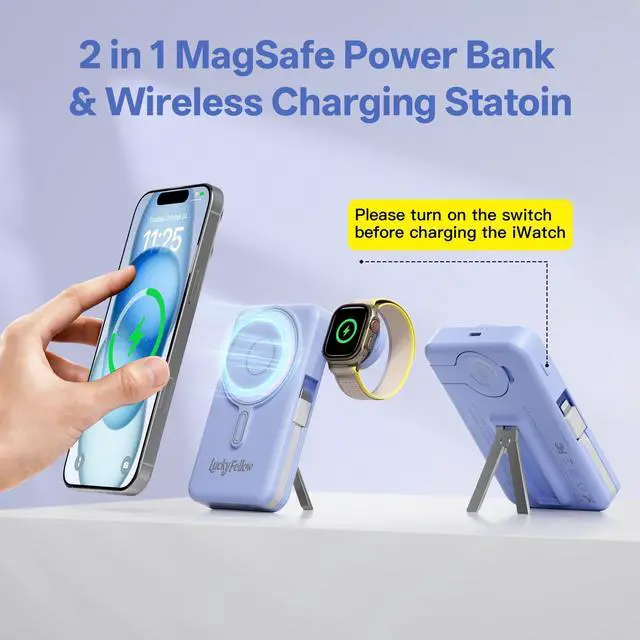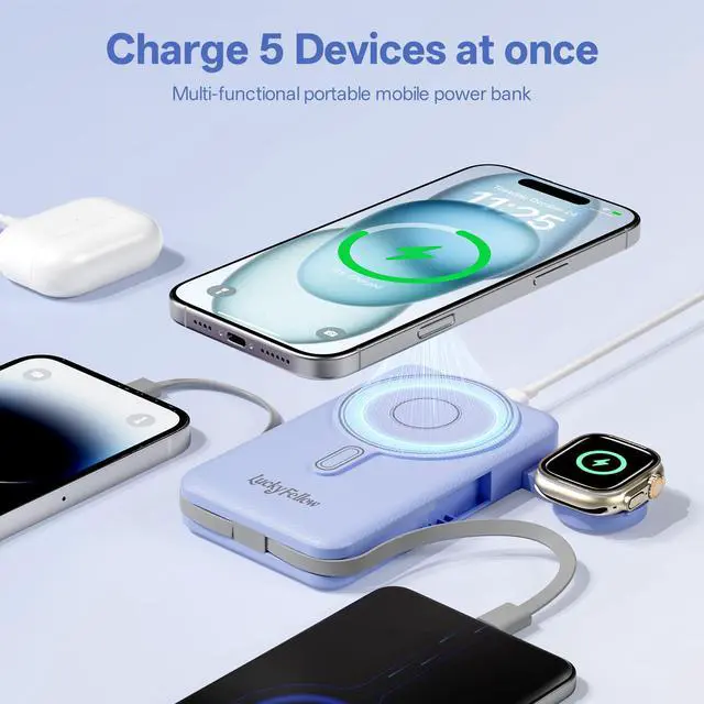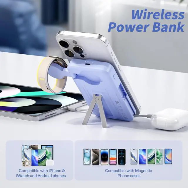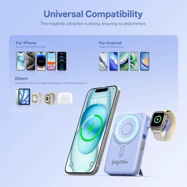 Wireless Magnetic Portable Charger for iPhone, Apple Watch, AirPods & Android Phones: Fully compatible with iPhone 17/16/15/14/13/12 series, and all Pro/Max models; Features a dedicated magnetic charger for Apple Watch Series 9/Ultra 2/8/7/6/SE/5/4, Airpods 2/3/Pro and more.At the same time, it is also compatible with the mainstream Android phones on the market.