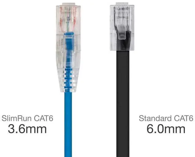 Monoprice SLIMRUN CAT6 UTP ETHERNET PATCH CABLES are designed for high density environments where space is a premium. SlimRun's ultra-slim 0.149-inch diameter 28AWG cable and narrow boot design reduces congestion and simplifies moves, additions, and changes. SlimRun Cat6 is component tested, which provides a better level of performance over channel-rated patch cables.