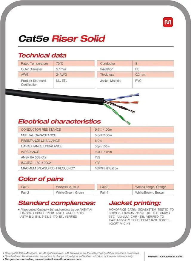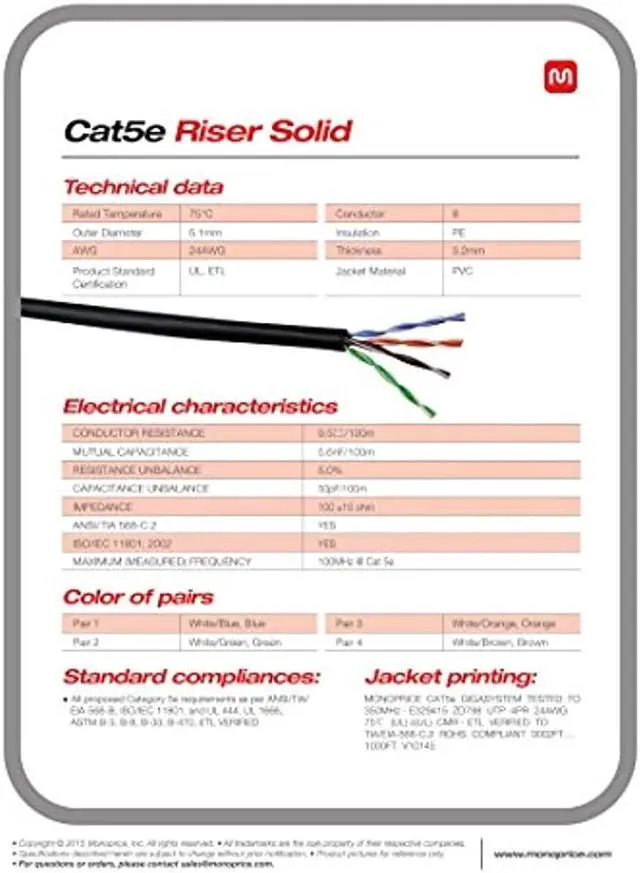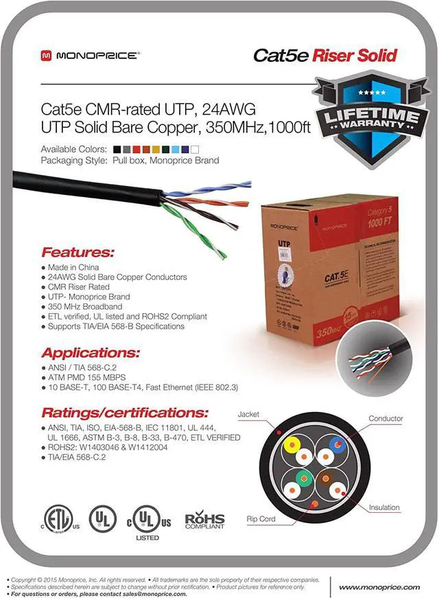 Buy with Confidence: With Monoprice's Lifetime Warranty on all Cables, you can rest assured we stand behind our products and our customers.|24AWG solid, pure bare copper conductors.|CMR (Riser) fire safety rating.|350MHz bandwidth.