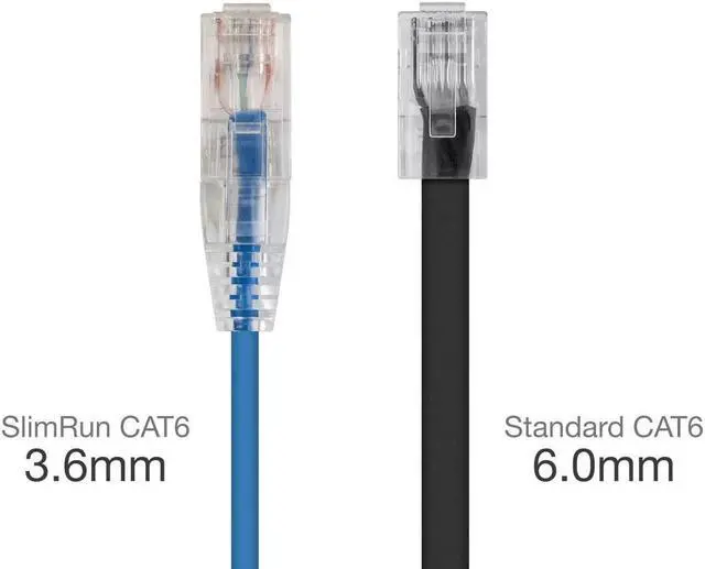 Monoprice SLIMRUN CAT6 UTP ETHERNET PATCH CABLES are designed for high density environments where space is a premium. SlimRun's ultra-slim 0.149-inch diameter 28AWG cable and narrow boot design reduces congestion and simplifies moves, additions, and changes. SlimRun Cat6 is component tested, which provides a better level of performance over channel-rated patch cables.