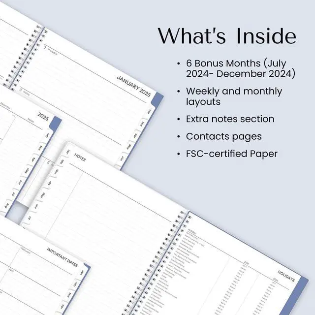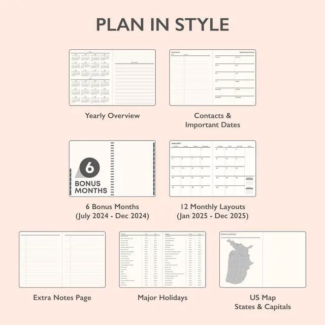 • Separate Sections: (6) Bonus Past Monthly Spreads (July-Dec); Holidays/Important Dates; Notes/Memos; Telephone/Address Directory; Yearly Goals; US Map
