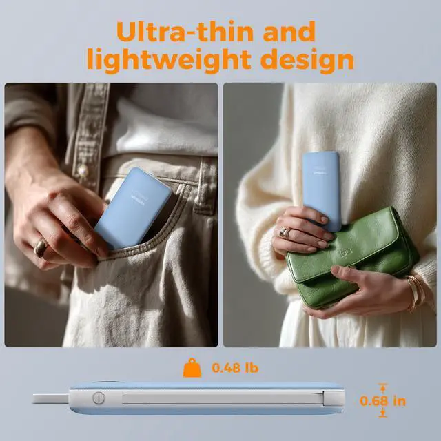 Only 0.68 inches thicknesses with the portable charger to carry anywhere.