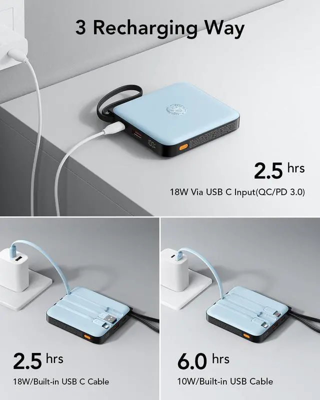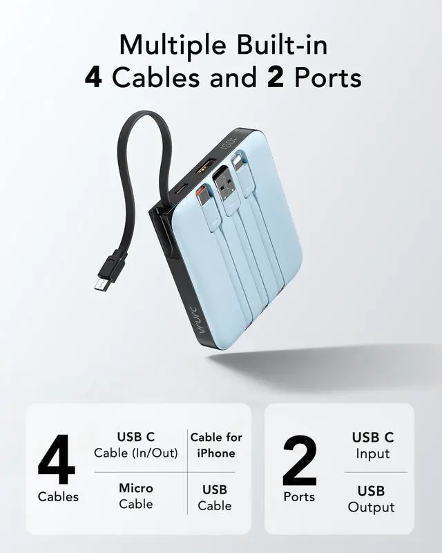 Power up your life with our versatile mobile power bank with USB-C Cable(also compatible with iPhone 17/16/15 series), iPhone Cable, USB-A, and Micro ports.