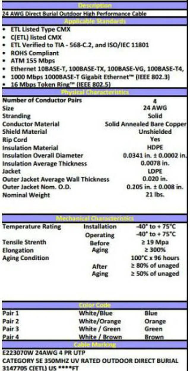 24 AWG Cat5E Outdoor UV Direct Burial Waterblock High Performance Ethernet Cable