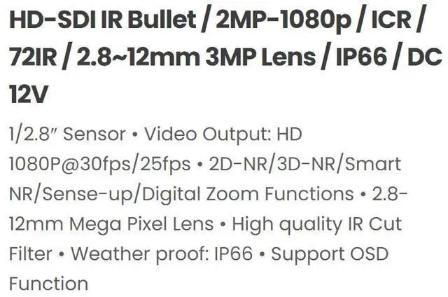HD-SDI IR Bullet / 2MP-1080p / ICR / 72IR / 2.8~12mm 3MP Lens / IP66 / DC 12V