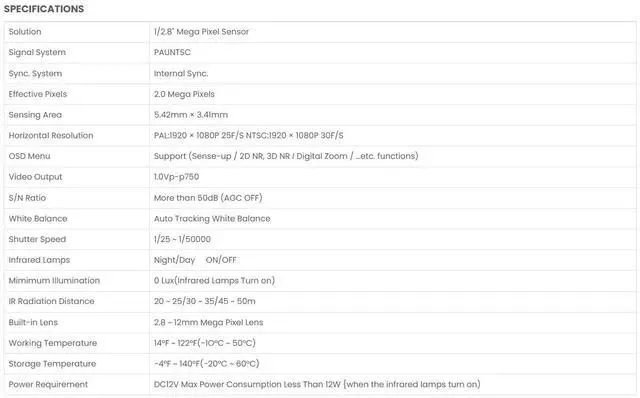 1/2.8 Sensor Video Output: HD 1080P@30fps/25fps 2D-NR/3D-NR/Smart NR/Sense-up/Digital Zoom Functions 2.8-12mm Mega Pixel Lens High quality IR Cut Filter Weather proof: IP66 Support OSD Function