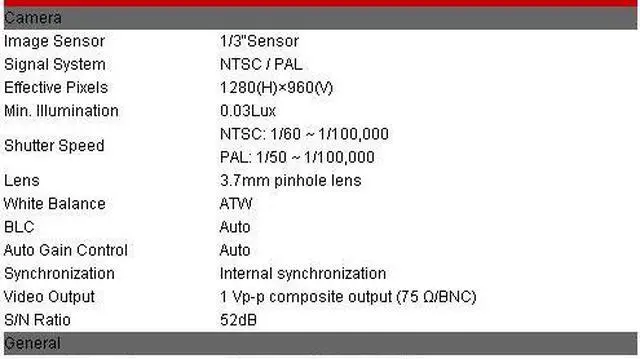 1.3MP, 1000TVL 1/3" Sensor, 3.7mm Pinhole Lens, DC 12V CM1912