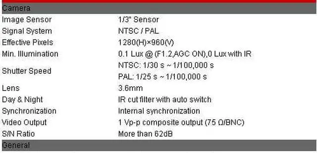 1/3" Sensor, 1280 (H) x 960 (V) Effective Pixels, True Day/Night, 3.6mm Fixed Lens, 131ft IR Distance, Smart IR CMR8412-36