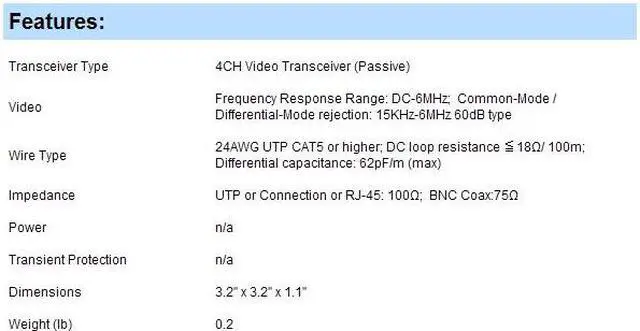 UTP or Connection or RJ-45: 100O; BNC Coax:75O