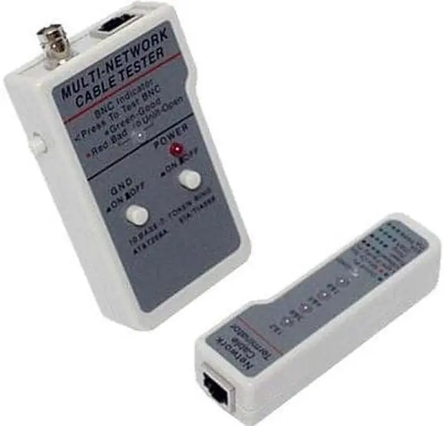 Multi-Network Cable Tester is designed to quickly test by auto scanning the wires continuity, miswiring and polarization in your network cables, thin Ethernet (BNC) / 10Base-T (UPT / STP) / 356A / TIA-568A / TIA 568B & Token Ring. By using the attached remote terminator, you can easily test the cable before or after the cables are installed. The Multi-Network Cable Tester also allows you to test the ground of Shielded Twisted Paired Cable. The Test Jacks are a BNC Female and a RJ45.