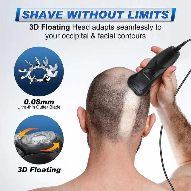 Pain-Free Shaving Experience:Enjoy a smooth, pain-free shave with this 3D rotating shaver. Equipped with ultra-thin blades (0.08mm) and a high-speed motor that reaches up to 10,000 RPM, the three floating blade heads adjust to the contours of your head, face, neck, and chin for a precise shave with minimal irritation. The lightweight and user-friendly design ensures a comfortable and smooth shaving experience.
