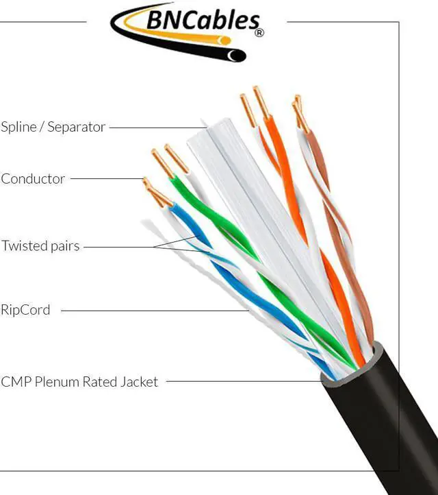BNCables CAT6 Plenum (CMP) UTP (Unshielded Twisted Pair) networking cable has enhanced performance and high 550MHz bandwidth capacity, fire retardant, meets, exceeds TIA/EIA 568-C. 2 standards. Our CAT6 plenum cable comes in easy pull box packaging for smooth and easy installation, and is ideal for commercial and residential networking. 23 Awg copper clad aluminum conductor insulated with hdpe to stop extreme attacks Our CAT6 plenum (CMP) rated jacket Ethernet cable comes in multiple colors and is best for computers, printers, gaming consoles, routers, Ethernet extenders, switch boxes, VoIP phones, IP cameras.