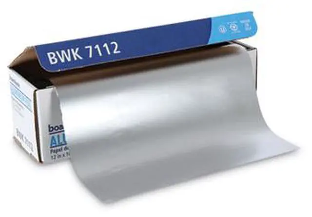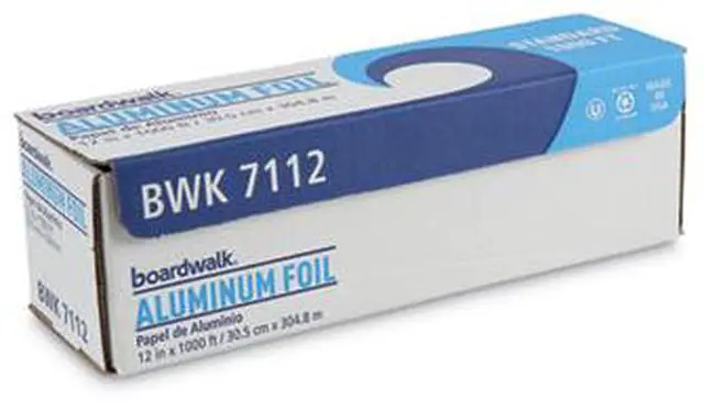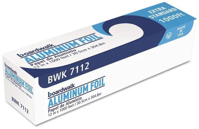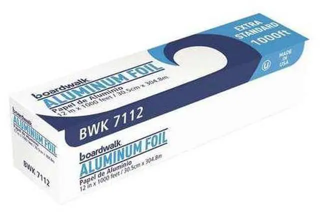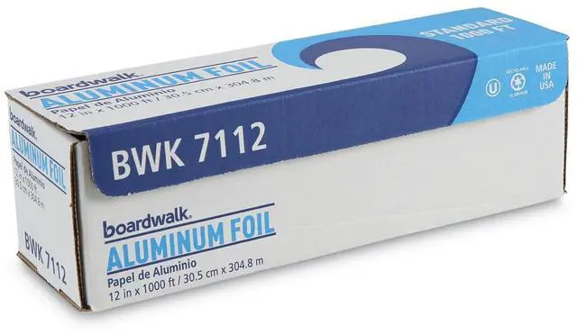 Boardwalk Standard Aluminum Foil Roll is high-quality aluminum foil with greater strength than standard rolls. Designed for heavy use with durable and tough foil that doesnt easily tear during use. 16-micron thickness is good for medium-level endurance. Foil conveniently comes in a continuous roll in a self-enclosing box, equipped with a tearing edge with standard cutting edges. Great for food service, cafeterias, restaurants, catering, and carry-out providers. Material(s): Aluminum Foil; Length: 1,000 ft; Width: 12"; Gauge: 63 Gauge.
