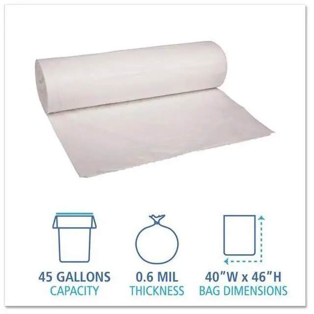 Performance bottom star seal to prevent leakage. Made from high-quality raw materials, mineral reinforced to enhance strength and puncture-resistance. Use with heavy loads and/or sharp/abrasive materials. Coreless rolls. Application: Can Liner; Capacity Range (Volume) [Max]: 45 gal; Capacity Range (Volume) [Min]: 40 gal; Thickness: 0.6 mil.