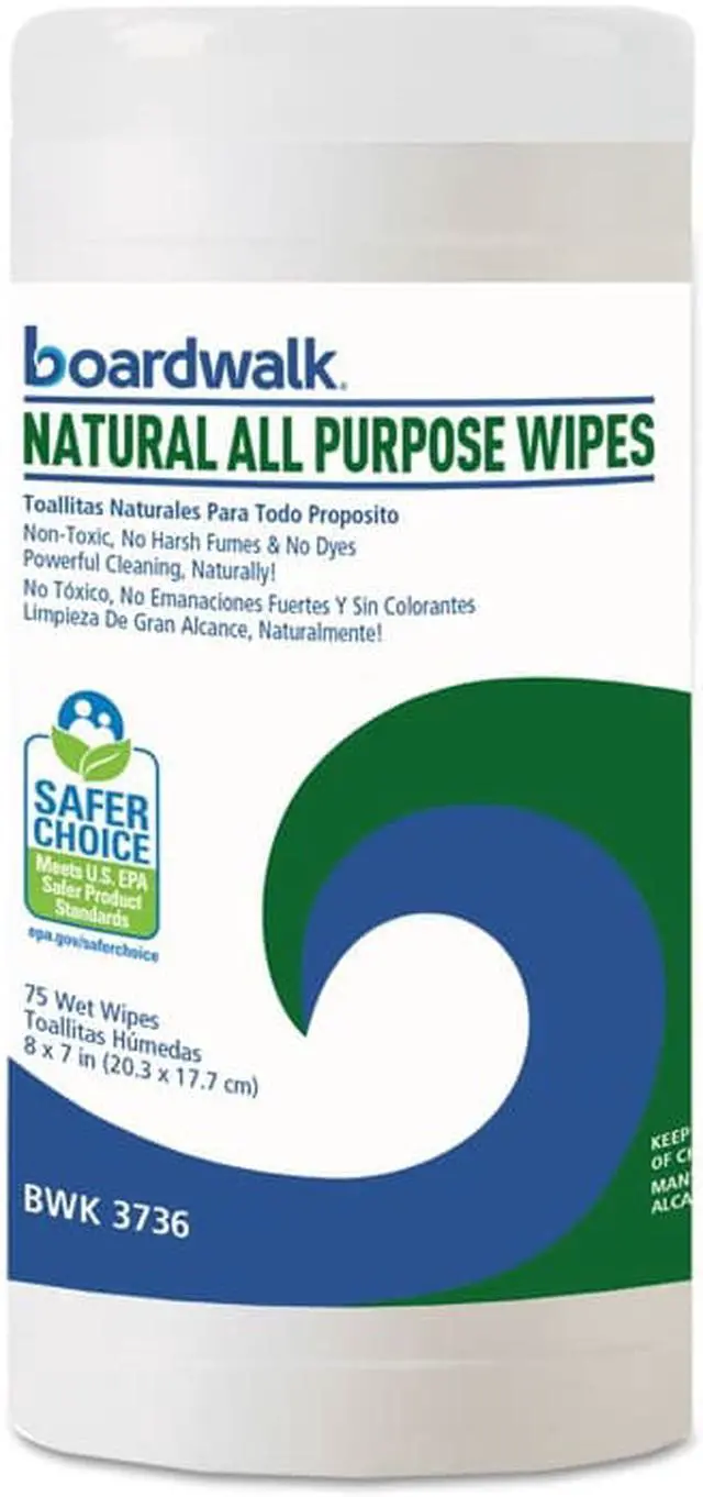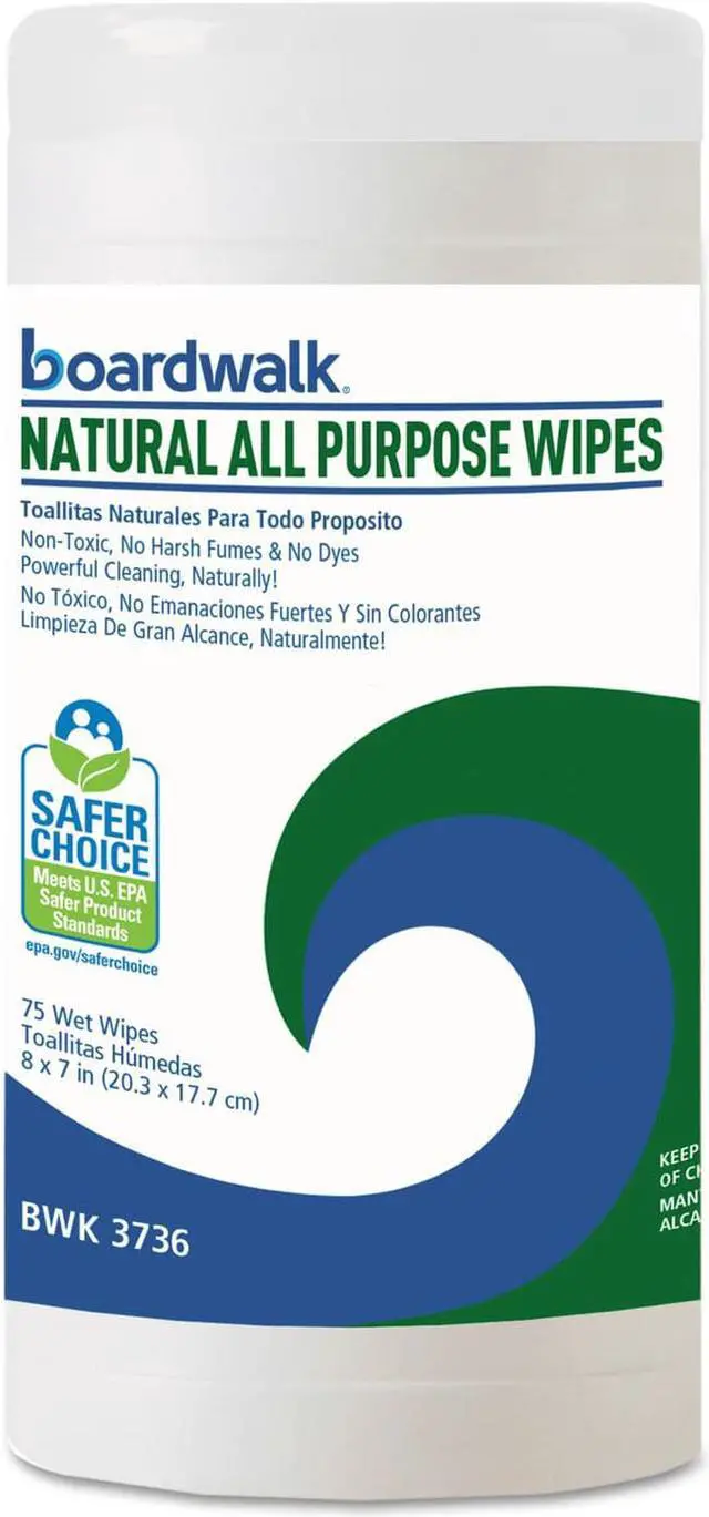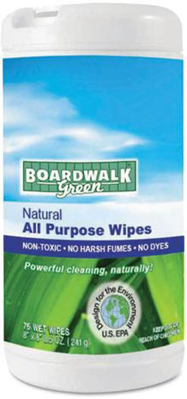 Natural, all-purpose cleaning wipes are non-toxic, have no harsh fumes, and contain no harmful chemicals. Durable cloth wipes will not tear and can be used on multiple surfaces. Convenient wipes keep your surfaces clean without leaving residue. Safe to use on multiple surfaces throughout your household, including counters, appliances, stainless steel, and sealed granite. Easy-to-use pop-up canister allows easy access--you can even grab wipes one-handed, speeding the cleaning process. For EPA/Safer Choice see: www.Boardwalklabel.com/disclosures Towel/Wipe Type: Cleaner/Detergent Wet Wipe; Application: All Purpose; Applicable Material: Hard Nonporous Surfaces; Material(s): 60 GSM Spunlace Composite Low.