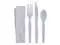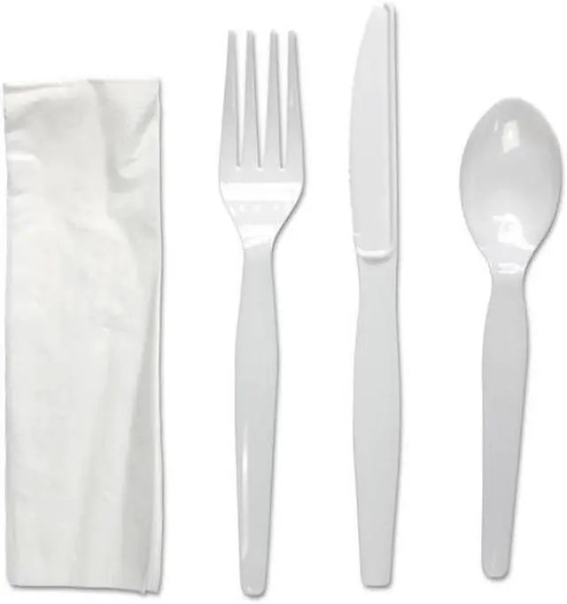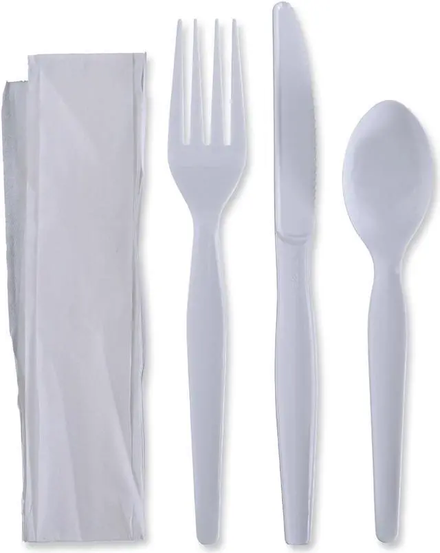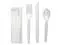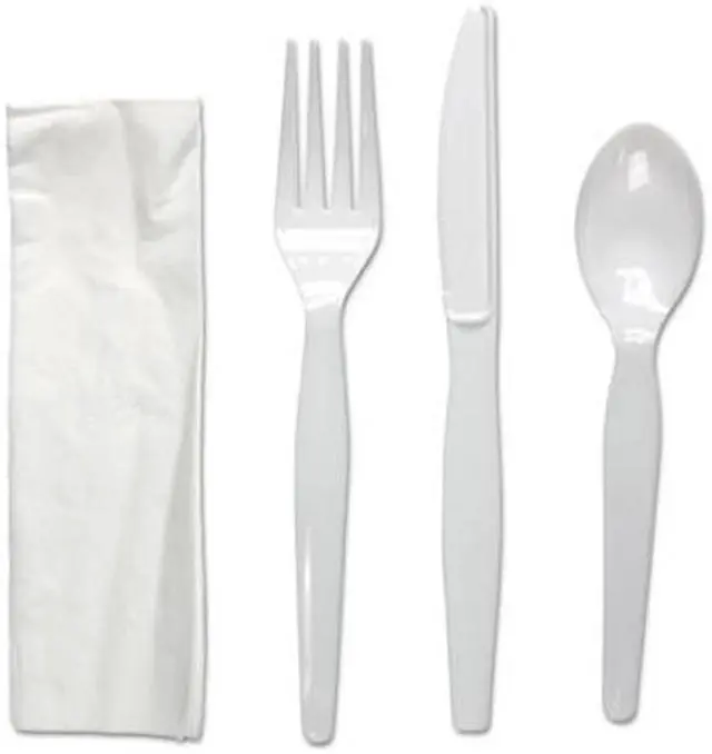 Why stock four items when you can have all of them in one convenient package? This kit contains a fork, spoon, knife, and napkin, allowing you to cover all of your bases with a single, high-quality item. Utensils Type: Fork; Knife; Napkin; Teaspoon; Material(s): Polystyrene; Color(s): White; Grade: Heavyweight.