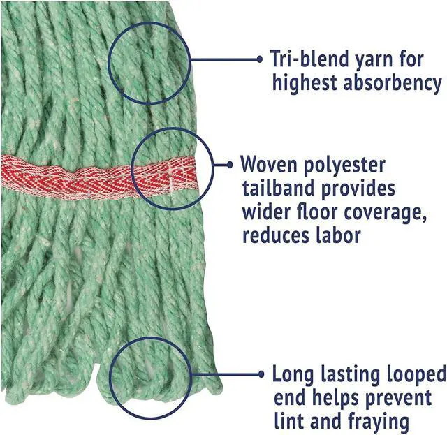 Boardwalk Super Loop Wet Mop Heads are created from premium-quality, four-ply cotton/synthetic yarn for maximum absorbency. The industrial strength mop head is designed for high-volume use. Each head absorbs up to seven times its own weight in liquid. Constructed to be more durable with heavy-duty, vinyl headbands. Machine washable. Launder in mesh bag. Use with clamp or spring grip-style handles, which are sold separately. 5" Headband. Mop Head Type: Wet Mop; Application: Floor Maintenance; Mop Head Style: Looped End; Mop Head Size: Large.