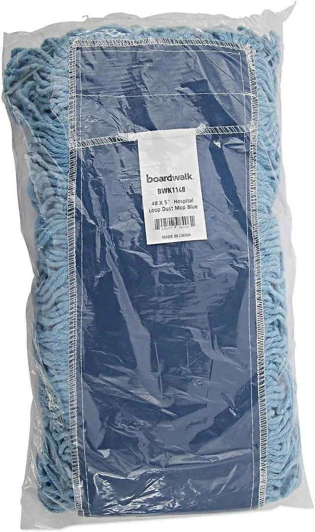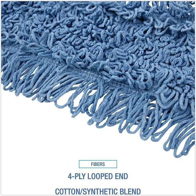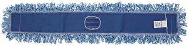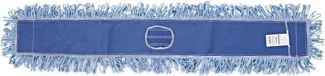 This dust mop head is sturdy and made from a four-ply cotton/synthetic blend. It has looped ends as well as reinforced backing ends and stress points for extra durability. Washable and reusable for added value and less waste. It is easy to use with a slot top/clip-on closure. Ideal for use on delicate, hard surfaces such as hardwood, laminate, tile, and marble. Frame and handle are sold separately. Mop Head Size: 48 x 5; Mop Head Color: Blue; Mop Head Material: Cotton/Synthetic Blend.