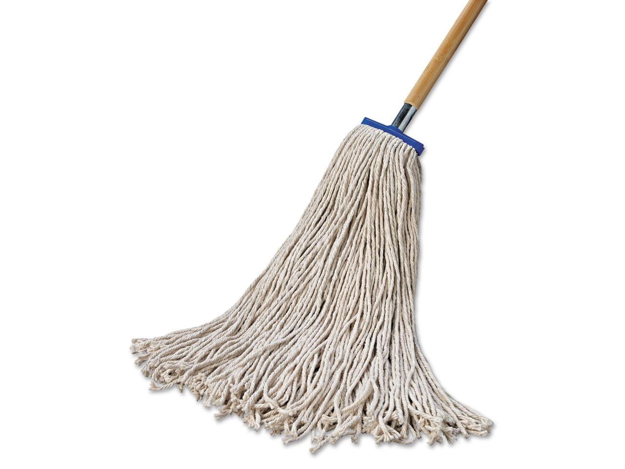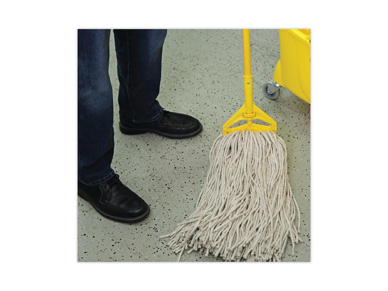 Premium, four-ply yarn mop lies flat on floor. Material: Plastic fiber. Headband size: 1 1/4".